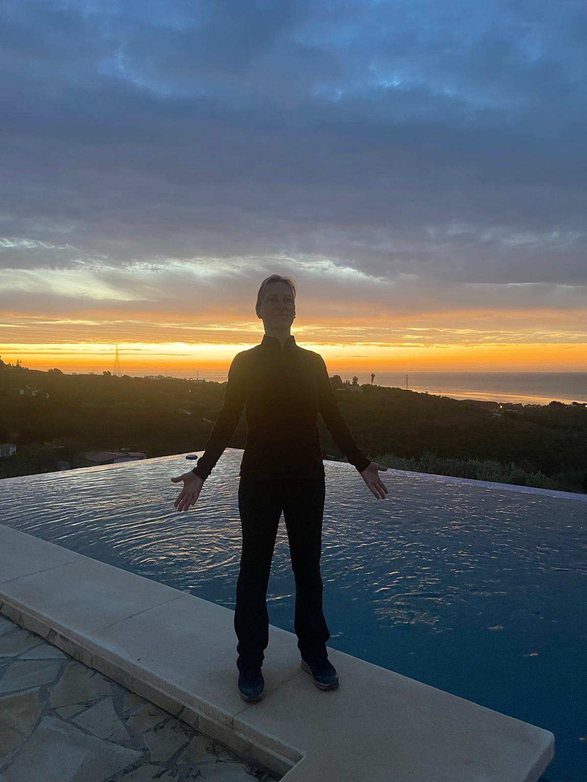 Au lever du soleil, ajoute une douce flexion arrière : ressens un moment de calme et d’harmonie avec la nature.