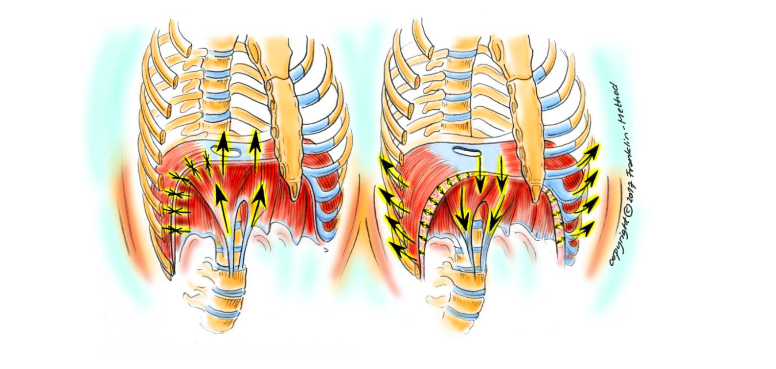 Cette belle image de la méthode Franklin montre comment le diaphragme s’allonge pendant l’expiration et se raccourcit pendant l’inspiration.